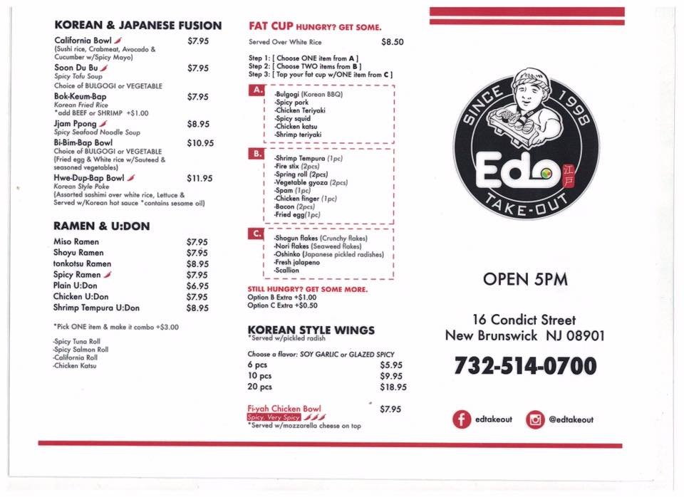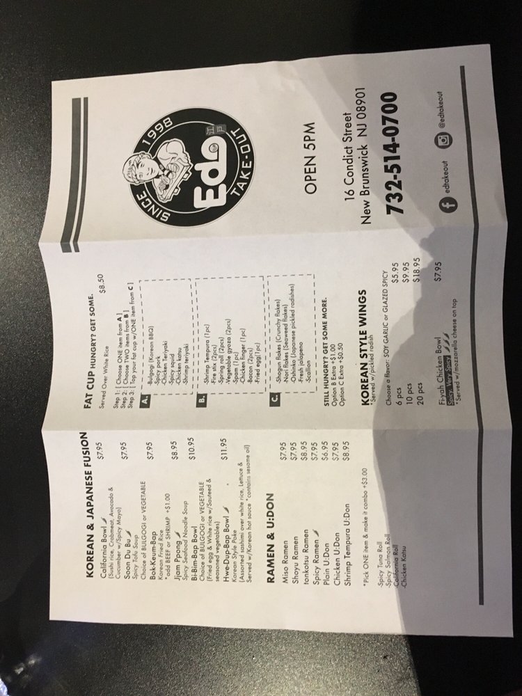 Welcome to Edo Takeout, a vibrant haven nestled in New Brunswick, NJ, where Asian fusion meets the artistry of sushi bars. This unclaimed gem is not just about sushi; it embraces a world of flavors, offering a rich menu that caters to diverse palates, including many vegetarian options. Whether you're savoring a delightful lunch, celebrating dinner, or enjoying a late-night bite, Edo Takeout ensures a casual yet trendy atmosphere that’s perfect for any occasion.