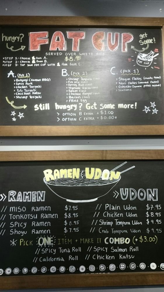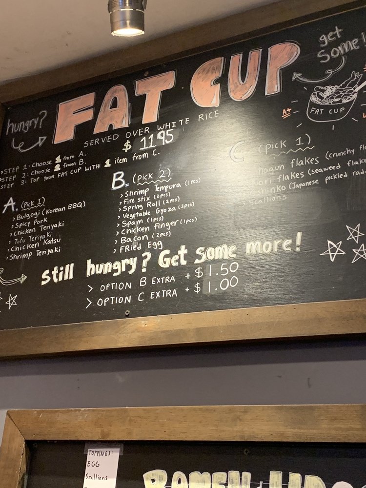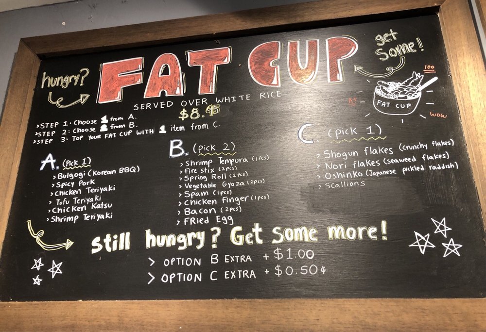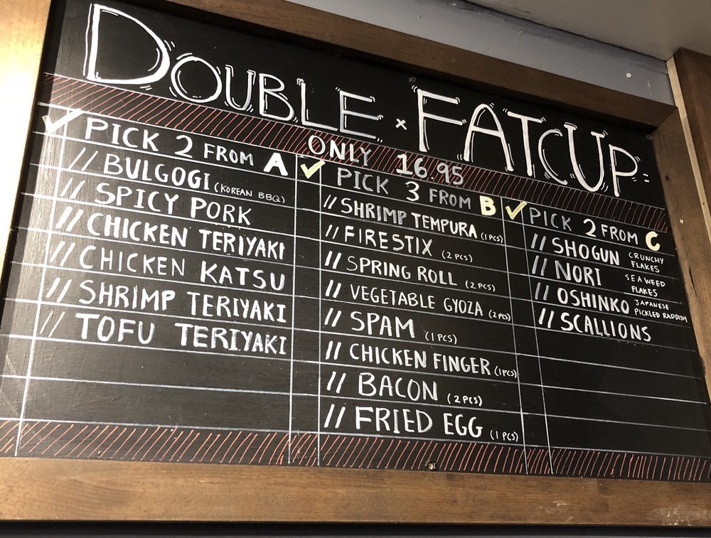 The original fat cup! Choice of main, additional proteins, and topping! All over white rice.